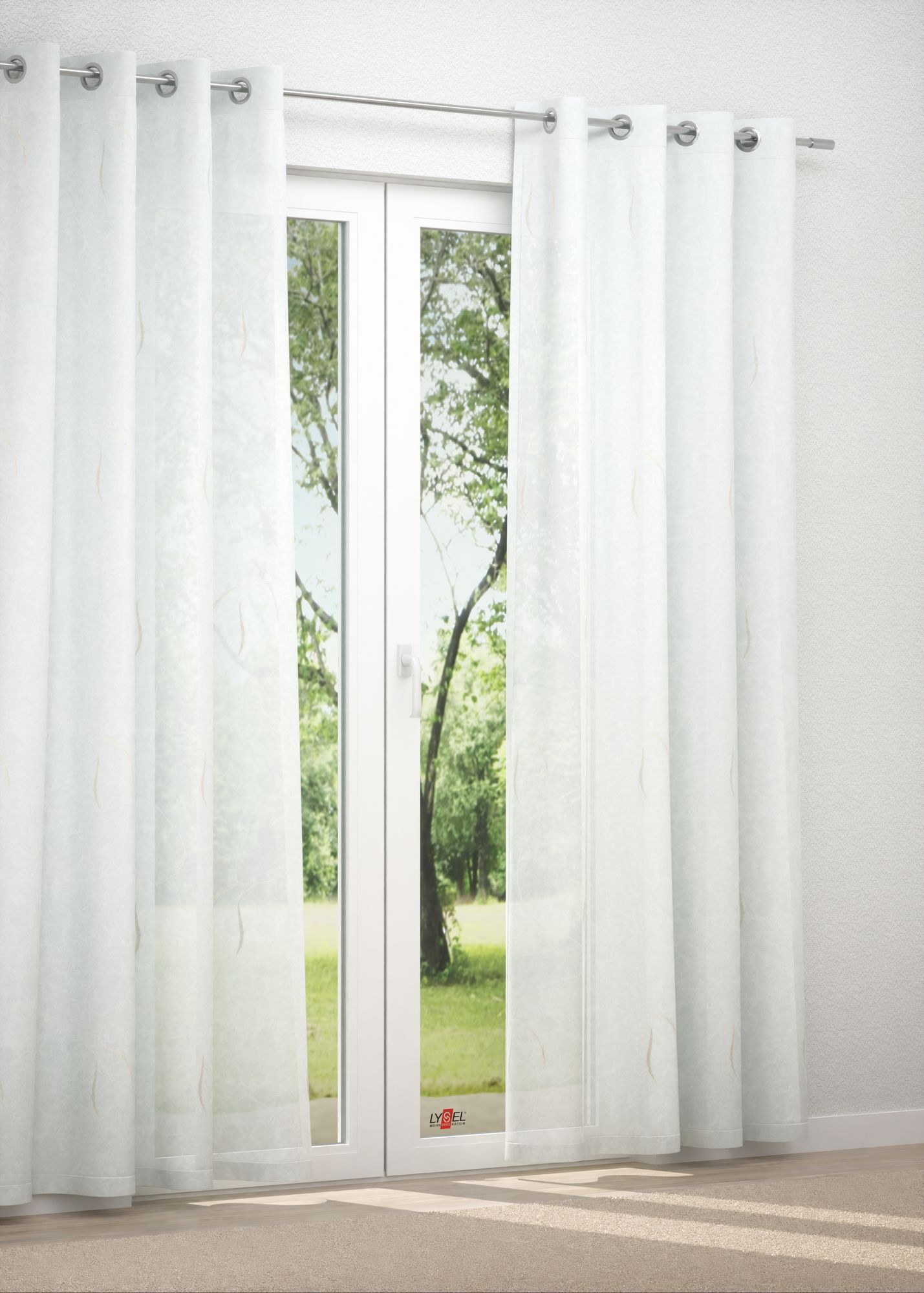 Der transparente Voilestoff verleiht dem Raum eine angenehme Luftigkeit und Leichtigkeit. Für lebendige Akzente sorgen die Crush-Struktur und die mit Effektgarn gestalteten, glänzenden Details, die in ihren geschwungenen Formen an Blätter oder Knospen erinnern können. Aus diesem Stoff können verschiedene Accessoires entstehen, zum Beispiel ein Gardinenschal nach Maß, der durch das Bleiband noch eleganter am Fenster herabfällt. Auch ein luftig-leichtes Raffrollo können Sie im Konfigurator zusammenstellen und dabei unter anderem die Aufhängung festlegen. Da das durchsichtige Gewebe viel Licht in den Raum lässt, wird dieser optisch vergrößert. Am Fenster erfüllt dieser Behang vor allem dekorative Zwecke. Nutzen Sie außerdem die Möglichkeit, den Stoff als Meterware zu bestellen. Dann können Sie Accessoires wie Deckchen und Tischläufer auch selbst nähen, das Design auf verschiedene Weise in den Raum integrieren und ein harmonisches Gesamtbild erzeugen.