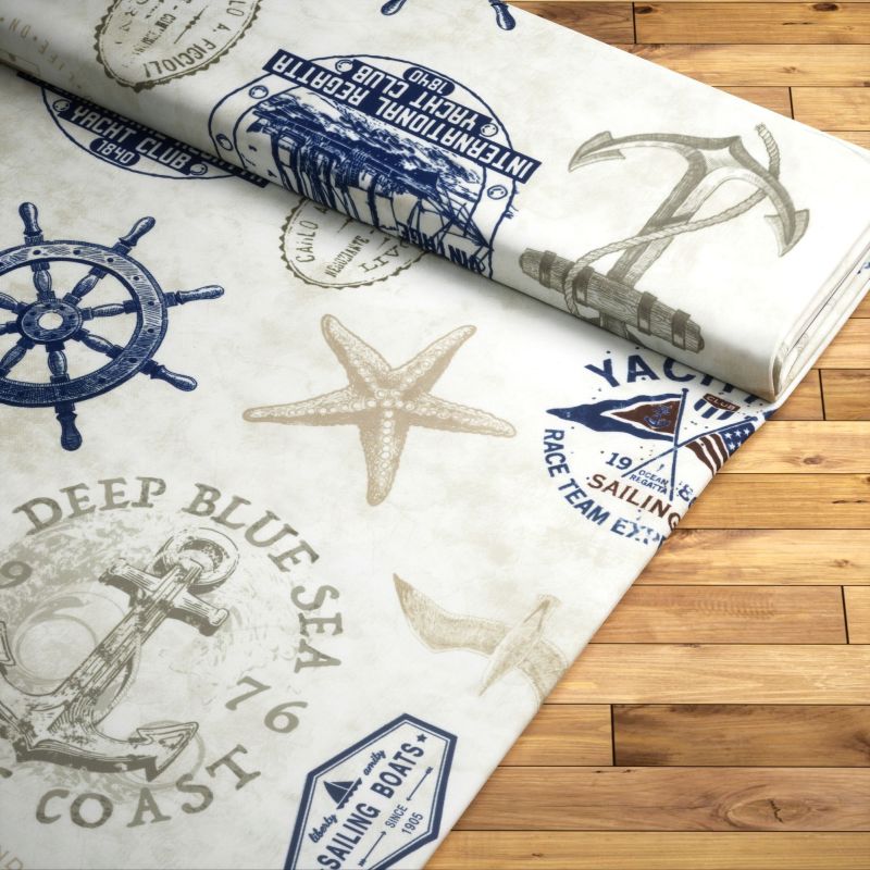 Ein raues, maritimes Küstenflair transportiert dieser Stoff mit leichter Marmorierung. Die griffige Haptik und die an Leinen erinnernde Oberfläche sorgen für eine naturnahe Aura. Dabei kann der Hintergrund an tosende Wellen erinnern und bietet den dort aufgebrachten Elementen zum Thema Küste und Seefahrt die beste Bühne. Möwen, Leuchttürme, Flaggen, Schilder, Steuerräder und Anker sind nur ein paar Beispiele. Durch die feine Gestaltung und die vielen Details treten sie dezent, dennoch wirkungsvoll hervor. Der lichtdurchlässige Polyesterstoff ist als Maß-Artikel und als Meterware erhältlich, sodass Sie Accessoires wie Kissenbezüge und Tischläufer auch selbst nähen können. Eine Fensterdeko, etwa einen Gardinenschal nach Maß, stellen Sie sich individuell im Konfigurator zusammen, entscheiden dabei auch, wie der obere Abschluss und untere Abschluss aussehen sollen.
