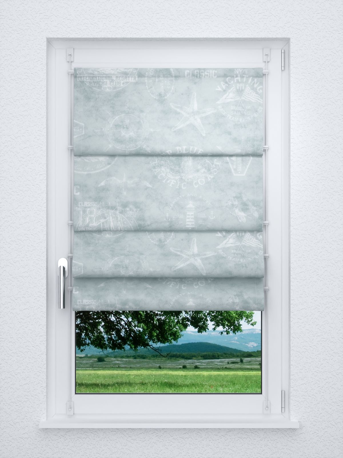 Ein raues, maritimes Küstenflair transportiert dieser Stoff mit leichter Marmorierung. Die griffige Haptik und die an Leinen erinnernde Oberfläche sorgen für eine naturnahe Aura. Dabei kann der Hintergrund an tosende Wellen erinnern und bietet den dort aufgebrachten Elementen zum Thema Küste und Seefahrt die beste Bühne. Möwen, Leuchttürme, Flaggen, Schilder, Steuerräder und Anker sind nur ein paar Beispiele. Durch die feine Gestaltung und die vielen Details treten sie dezent, dennoch wirkungsvoll hervor. Der lichtdurchlässige Polyesterstoff ist als Maß-Artikel und als Meterware erhältlich, sodass Sie Accessoires wie Kissenbezüge und Tischläufer auch selbst nähen können. Eine Fensterdeko, etwa einen Gardinenschal nach Maß, stellen Sie sich individuell im Konfigurator zusammen, entscheiden dabei auch, wie der obere Abschluss und untere Abschluss aussehen sollen.