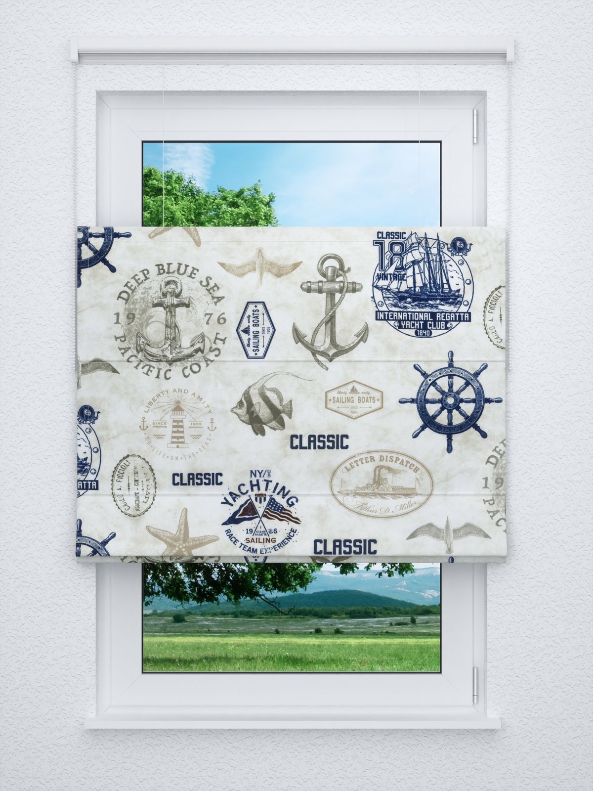 Ein raues, maritimes Küstenflair transportiert dieser Stoff mit leichter Marmorierung. Die griffige Haptik und die an Leinen erinnernde Oberfläche sorgen für eine naturnahe Aura. Dabei kann der Hintergrund an tosende Wellen erinnern und bietet den dort aufgebrachten Elementen zum Thema Küste und Seefahrt die beste Bühne. Möwen, Leuchttürme, Flaggen, Schilder, Steuerräder und Anker sind nur ein paar Beispiele. Durch die feine Gestaltung und die vielen Details treten sie dezent, dennoch wirkungsvoll hervor. Der lichtdurchlässige Polyesterstoff ist als Maß-Artikel und als Meterware erhältlich, sodass Sie Accessoires wie Kissenbezüge und Tischläufer auch selbst nähen können. Eine Fensterdeko, etwa einen Gardinenschal nach Maß, stellen Sie sich individuell im Konfigurator zusammen, entscheiden dabei auch, wie der obere Abschluss und untere Abschluss aussehen sollen.