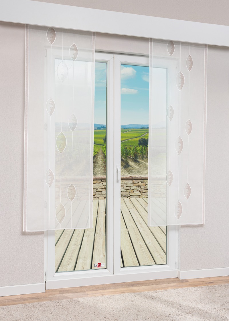 Ein hervorstechendes Merkmal dieser Scheibengardine aus Plauener Spitze® ist das abstrakte Blättermuster, welches vertikal, wie auf einer Schnur gezogen durch den Stoff läuft. Bei näherem Hinsehen erkennt man, dass die Struktur der Blätter völlig unterschiedlich gestaltet ist. Dieser kreative Kniff erhöht die Attraktivität des Modells und unterstreicht die naturverbundene, ebenso moderne Ausstrahlung. Nicht minder exklusiv ist die Einfassung der Rapporte. Angesichts der Transparenz des Polyesters verspricht das florale Muster interessante Licht- und Schattenspiele. Auch bei geschlossenem Behang gelangt stets genügend Tageslicht in den Raum. Mit dieser Deko, die durch Stangendurchzug am Fenster befestigt wird, bleiben Zimmer lange hell und freundlich, der Blick ins Freie außerdem unverstellt. Der Behang wird nach Maß gefertigt und bietet vielfältige Kombinationsmöglichkeiten. Außer als Scheibenhänger können Sie das Blättermotiv auch als Flächenvorhang oder elegante Kurzgardine am Fenster dekorieren. Die Einsetzbarkeit des umwelt- und pflegefreundlichen Stoffes ist also sehr vielseitig.