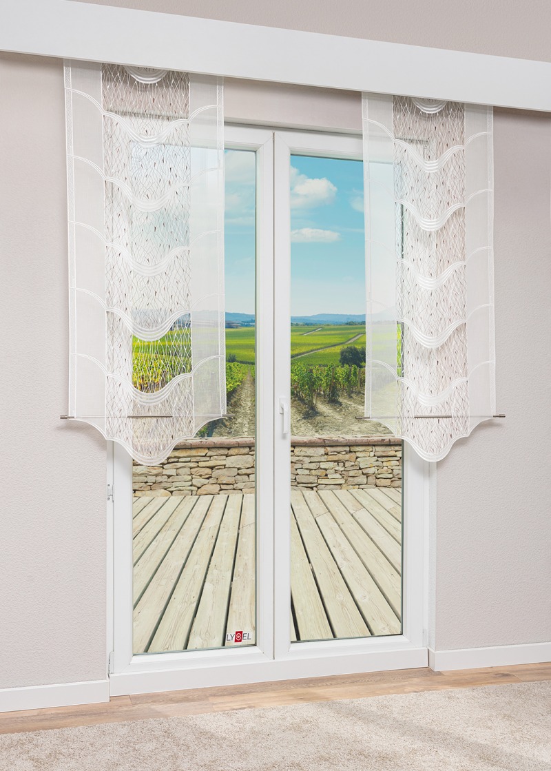 Charakteristisches Merkmal dieses Scheibenhängers sind die kühn geschwungenen Rapporte und der damit einhergehende wellenartige untere Abschluss. Die Übergänge bestehen aus filigranen, netzartigen Stickereien aus Plauener Spitze®, welche die Transparenz des Polyesters unterstützen und für viel Helligkeit im Raum sorgen. Der untere Saum der Rapporte wird durch geschwungene Linien gebildet, die mit den senkrechten Streifen an den Seiten eine harmonischen Einheit bilden. Das Muster ist zentral in der Mitte der Gardine platziert, die Seiten sind eher schlicht gehalten, dennoch ansprechend gesäumt. Die Transparenz des Gewebes kann einfallende Sonne leicht dimmen, bietet ansonsten aber ein hübsches Spiel von Licht und Schatten. Da der Behang einen Stangendurchzug besitzt, ist die Befestigung am Fenster ein Kinderspiel. Oberhalb des unteren Saums haben Sie zusätzlich die Möglichkeit eine Zierstange einzusetzen, die als Zubehör im Shop bestellt werden kann. Da es die maßgefertigte Rapportware in verschiedenen Größen, aber auch als Flächenvorhang gibt, sind Ihrer Kreativität am Fenster keine Grenzen gesetzt. Schonend waschen können Sie das Modell bei 30°C in der Maschine.