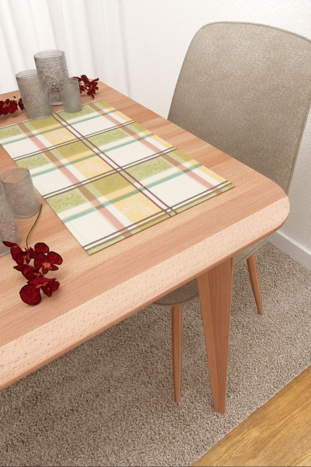 Die zartgrünen, weißen und hellgelben Felder nehmen den größten Teil der Fläche ein. Sie bilden den Hintergrund für die floralen Stickereien, die sich jeweils dezent von diesem abheben. Abgegrenzt werden die Felder durch Linien in Gelb, Petrolblau, Dunkelrot und Rotviolett, die sich wirkungsvoll und kontraststark von dem Hintergrund unterscheiden und dem ganzen Design eine moderne Note geben. Indem Sie in der Deko Farben des Stoffes aufgreifen, wirkt der gesamte Raum einladend und harmonisch.