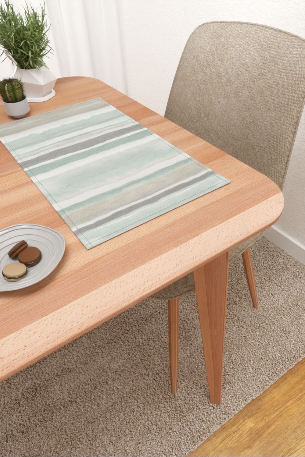 Mit der Gestaltung in verschiedenen Minttönen, Grauoliv und Weiß bringt dieser Stoff die Leichtigkeit des Sommers zum Ausdruck. Entspannend und erfrischend zugleich lockert er das Ambiente auf und trägt zu einem freundlichen Flair bei. Indem Sie weitere Blautöne wie Türkis und Petrol ergänzen, Naturmaterialien wie Holz, Leinen und Rattan sowie sanfte Erdfarben einsetzen, wird das Urlaubsfeeling perfekt.