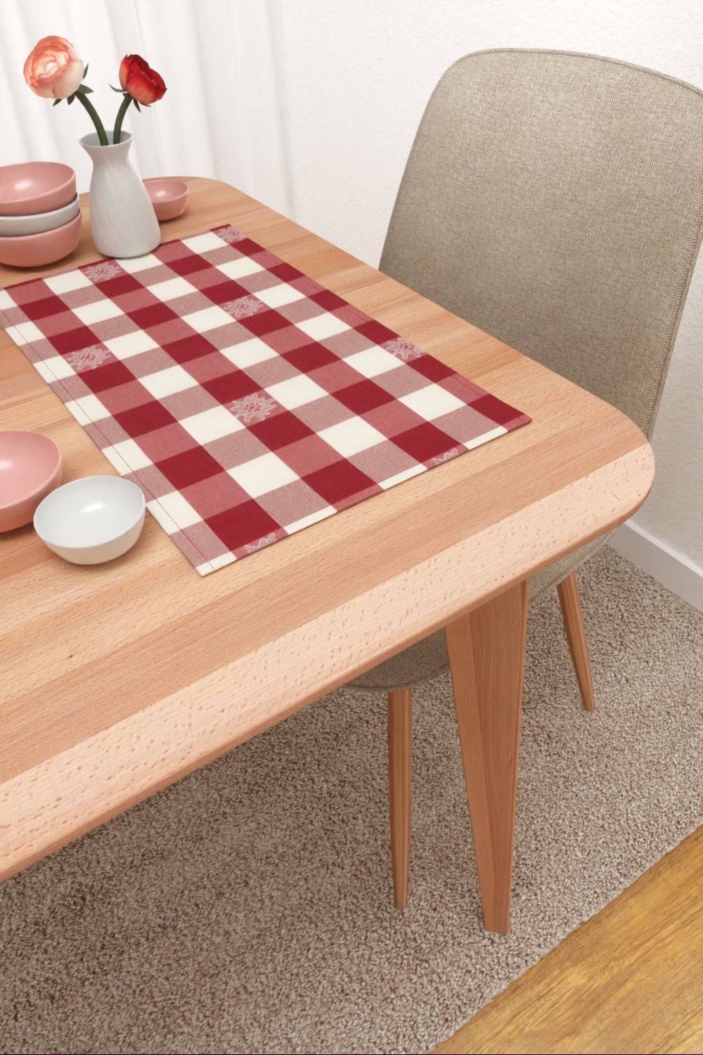 Das lebendige und kontraststarke Karomuster setzt sich hier aus edlem Weinrot und Weiß zusammen, was wiederum für eine freundliche, einladende Atmosphäre sorgt. Das warme, glutvolle Rot und das helle, frische Weiß ergänzen sich perfekt und ergeben eine wunderbare Harmonie. Naturmaterialien wie Leinen, Wolle und Holz sowie verschiedene Grüntöne setzen ein Accessoire aus diesem Stoff geschmackvoll in Szene.