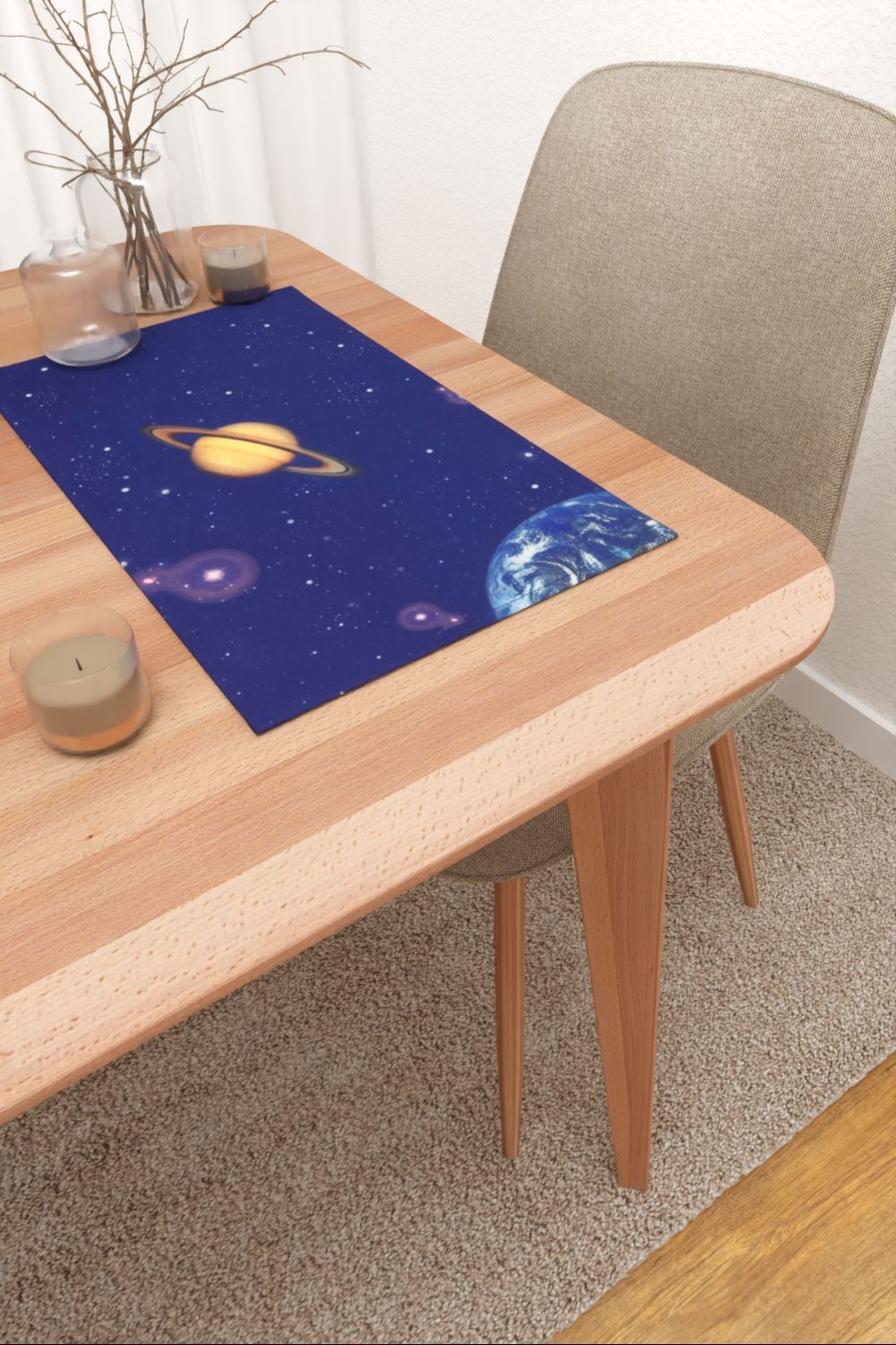Der dunkle Blauton des Himmels ist hier besonders präsent. Er geht auch ein bisschen ins Blaulila und besitzt daher auch einen mystischen Moment. Die hellen Sterne scheinen regelrecht zu funkeln, die bunten Planeten zu leuchten. Verleihen Sie Ihren Räumen mit diesem Modell eine außergewöhnliche Atmosphäre. Helle Grautöne und Weiß bringen den Ausdruck des Motivs am besten heraus.