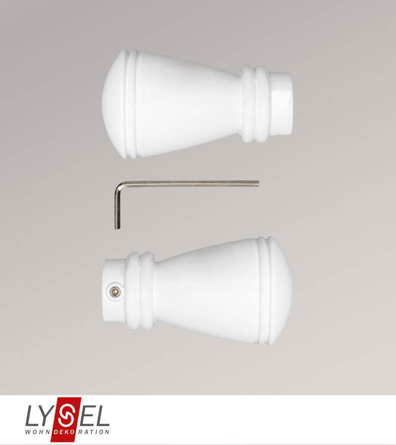 Diese Endstücke aus Metall erinnern an einen Türknauf und passen daher besonders gut zu Einrichtungen im klassischen, Landhaus- oder repräsentativen Stil. Sie können auf Opal Gardinenstangen sowie andere Gardinenstangen mit einem Durchmesser von 20 mm aufgesetzt werden. Hier ist im Lieferumfang ebenfalls ein Innensechskantschlüssel enthalten, welcher zur Fixierung dient.