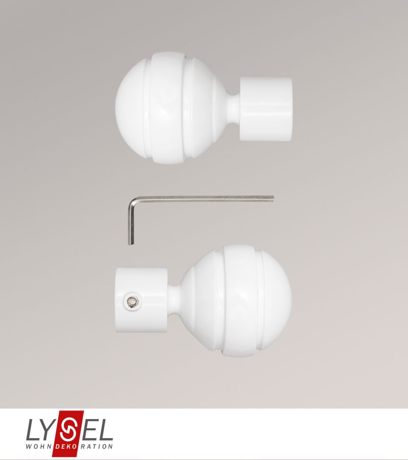Diese Endstücke aus Metall haben die Form einer Kugel und können Opal Gardinenstangen sowie andere Gardinenstangen mit einem Durchmesser von 20 mm zieren. Mit dem beiliegenden Innensechskantschlüssel werden sie fixiert und auf die gleiche Weise können die Endstücke wieder entfernt werden. Durch zwei breite Einkerbungen wird die Kugel in drei Bereiche unterteilt und kann ferner an einen Türknauf erinnern.