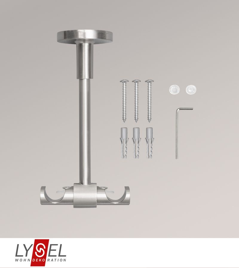Dieser drehbare, offene Deckenträger aus Metall eignet sich für zweiläufige Dekorationen mit Topaz Gardinenstangen sowie anderen Gardinenstangen und Gardinenstangen mit Innenlauf und einem Durchmesser von 16 mm. Der Deckenträger von 13,5 cm Länge wird mit dem beiliegenden Material an die Decke geschraubt, anschließend die Gardinenstangen eingelegt und eingeklickt. Die Vorhänge, die Sie daran aufhängen, sind dann etwa 5 cm voneinander entfernt und haben somit ausreichend Platz. Für einen stabilen Halt empfehlen wir ab einer Stangenlänge von 200 cm drei Träger zu verwenden.